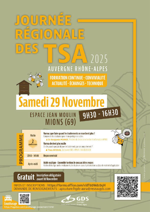 📅 22–27 septembre 2025, puis 6–7 novembre 2025 📍 MFR des Dronières, près de Cruseilles (Haute-Savoie – 74) Vous souhaitez devenir TSA (Technicien Sanitaire Apicole) ? Le GDSA 74 organise à l’automne une formation initiale TSA, ouverte aux apiculteurs des autres...